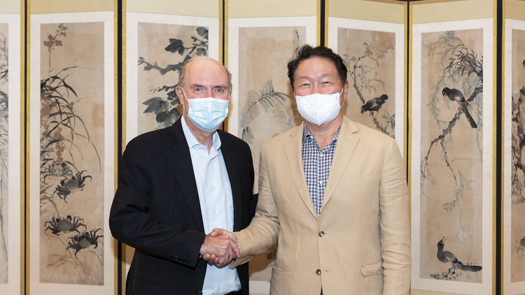 최태원 SK그룹 회장은 6일 서울 종로구 SK서린사옥에서 미국 수소에너지 선도기업인 플러그파워의 앤드류 J. 마시 CEO를 만나 다양한 수소 관련 기술을 통해 수소 생태계를 구축해 나가기로 의견 나눠.