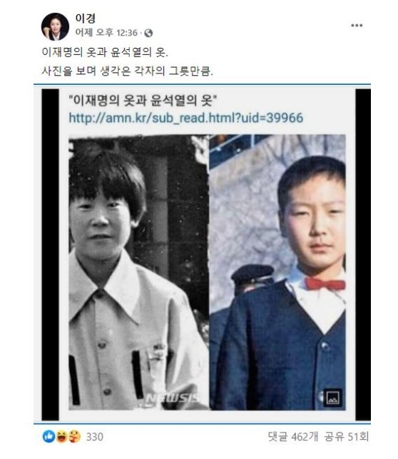더불어민주당 대권 주자인 이재명 경기지사측이 윤석열 전 검찰총장의 어린 시절과 비교하는 사진을 올린 것을 놓고 여진이 이어지는 모양새. 지난 7일밤 이재명 캠프 이경 대변인이 SNS에 이 지사와 윤 전 총장의 어린 시절 모습을 이어붙인 사진을 올린게 발단.