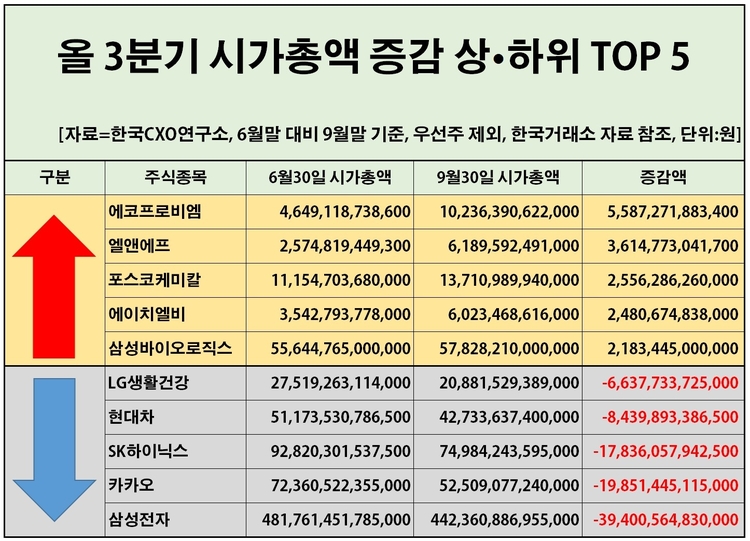 올 3분기에만 시총이 1조 원 감소한 곳은 모두 34곳으로 집계됨. 반면 시총이 1조 원 넘게 증가한 곳은 절반 수준인 18곳.