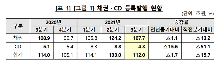 한국예탁결제원은 올해 3분기 예탁원 전자등록시스템을 통한 채권·양도성예금증서(CD) 전자등록 발행규모가 작년 동기 대비 1.7% 감소한 112조원으로 집계됐다고 18일 밝힘. 직전 분기 대비 15.7% 감소한 수치.