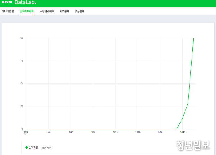 26일 포털사이트 네이버의 검색량조회시스템 '데이터랩'에 따르면 '설거지론'이라는 신종 키워드가 폭발적인 관심사로 부각되며 일일 키워드 검색량이 전주 대비 100배 이상 상승했다.
