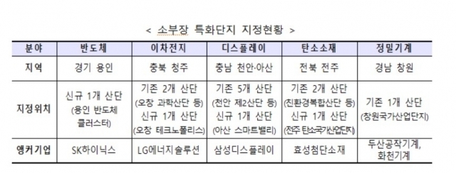 지금까지 반도체(경기 용인), 이차전지(충북 청주), 디스플레이(충남 천안·아산), 탄소소재(전북 전주), 정밀기계(경남 창원) 등 5개 분야의 특화단지가 지정됐다.