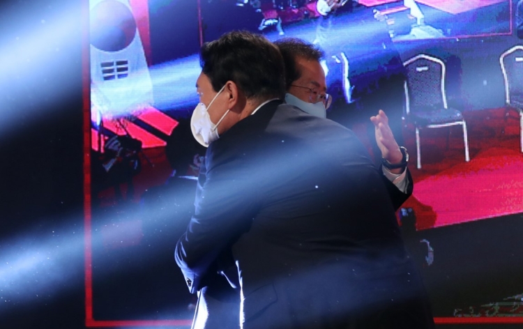 특히 윤 후보와 1위를 놓고 다퉜던 홍 의원은 "경선 결과에 깨끗하게 승복한다"라며 "윤석열 후보님께 축하드리고 국민 여러분과 당원동지 여러분 모두 합심해서 정권교체에 꼭 나서주도록 당부드린다"라고 언급. 윤 후보와 포옹할 때 어깨 위로 드러난 홍 의원의 얼굴 미소에 눈길이 몰려.