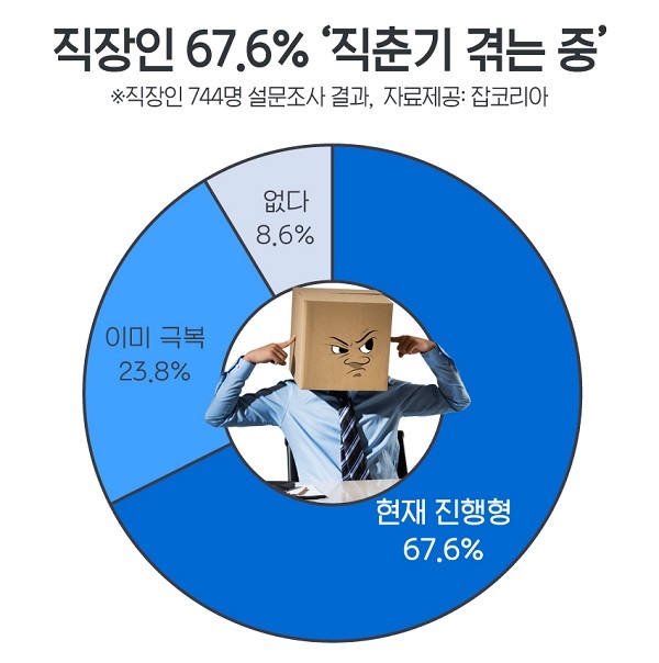 대부분의 직장인이 직춘기를 겪어본 것으로 나타난 가운데 67.6%에 달하는 직장인이 '현재 직춘기를 겪고 있다'고 응답했다.