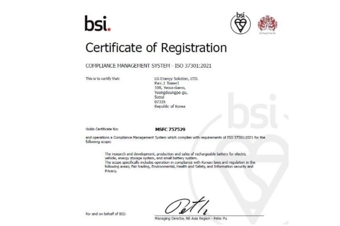 ◆ LG엔솔, ISO37301 인증 획득… "전 세계 배터리 업계 최초"