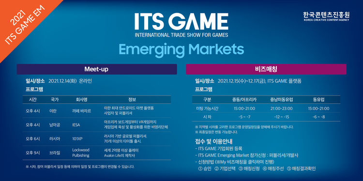 【 청년일보 】 문화체육관광부와 한국콘텐츠진흥원은 국내 우수 게임 콘텐츠의 해외 및 신흥 시장 진출을 지원하기 위한 온라인 비즈니스 플랫폼 '잇츠게임(ITS GAME)'을 통해 '잇츠게임 이머징 마켓'을 12월 14일부터 17일까지 온라인 개최한다.