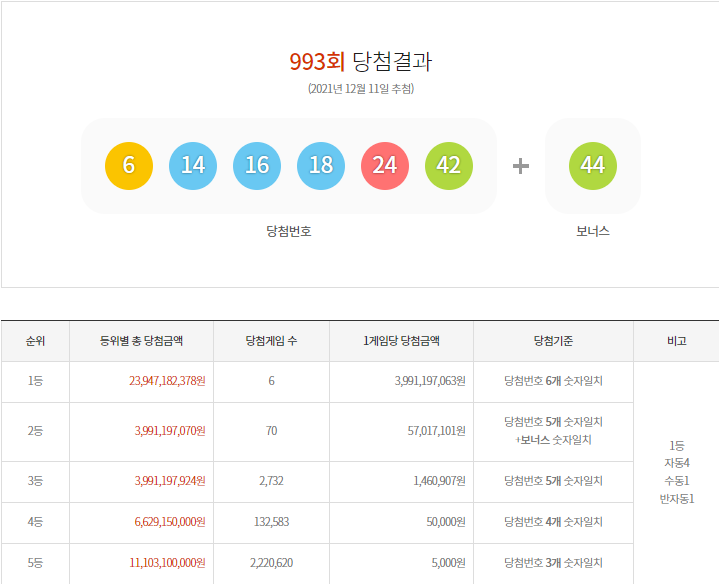 【 청년일보 】동행복권은 지난 11일 제993회 로또복권 추첨에서 '6, 14, 16, 18, 24, 42'가 1등 당첨번호로 뽑혔다고 밝혔다. 2등 보너스 번호는 '44'이다.