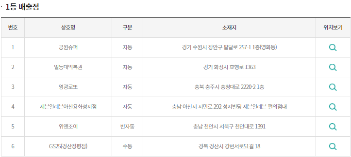 당첨번호 6개를 모두 맞힌 1등 당첨자는 6명으로 39억9천120만원씩 받는다.