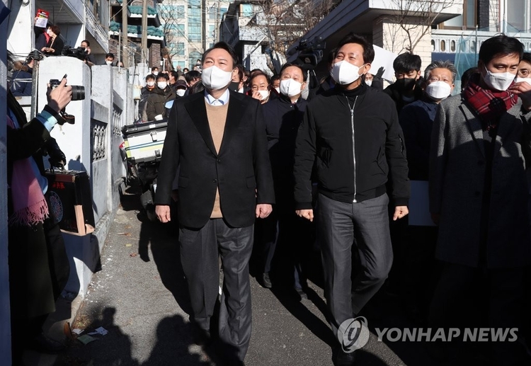 이날 오세훈 시장은 국민의힘 윤석열 대선 후보를 만나 둘이 함께 서울 강북구 재건축 현장을 방문. 이후 기자들에게 "그동안 서울 지역 재개발·재건축 주거환경 정비사업의 경우 약 10년간 멈춰 서 있다고 해도 과언이 아니다"라며 재개발 사업에 대한 속도 의지를 피력.