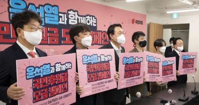 국민의힘은 당사에서 당 후원금인 '국민후원금' 모금 캠페인을 개최. 윤석열 대선 후보와 이준석 대표, 권성동 사무총장이 참석한 가운데 국민후원회장으로는 김윤후(34·연극배우) 씨, 이용진(23·대학생), 김철수(77·에이치플러스 양지병원 이사장)씨가 임명.
