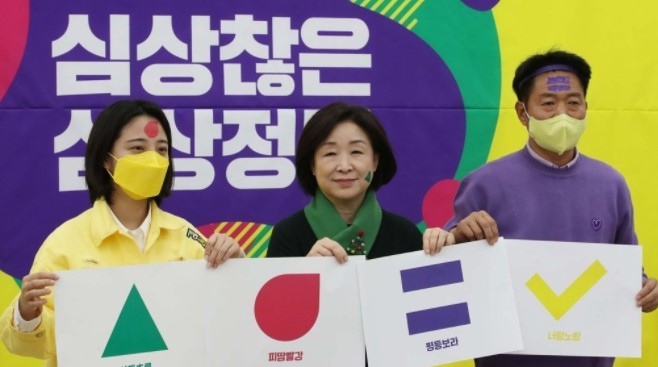 심상정 대선 후보는 "다양한 색들이 연대하고, 공존하는 사회가 바로 저 심상정이 달려가고자 하는 미래이고, 제가 제시한 다당제 책임 연정의 색깔"이라며 "(대선까지) 남은 82일 동안에 빨강, 녹색, 보라색이 모두 손잡을 수 있도록 노란 희망의 원을 더 넓게 그리겠다"고.