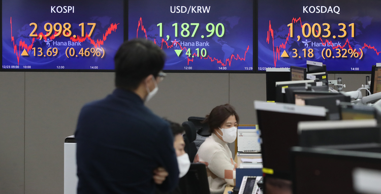 23일 한국거래소에 따르면 코스피는 전날보다 13.69포인트(0.46%) 오른 2,998.17에 거래를 마쳤다.
