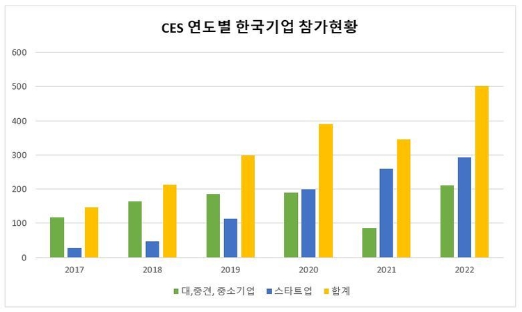 이한범 한국정보통신기술산업협회(KICTA) 상근부회장은 "산업부 KOTRA ,중기부 창업진흥원 및 지방자치단체, 창조경제혁신센터, 대학교 산학협력단 등에서 해외 진출을 적극적으로 지원한 결과 CES 참가사가 크게 늘었다"며 "2023년에는 더 많은 기업이 참가하도록 정부의 수출 마케팅 지원이 필요하다"고 말했다.