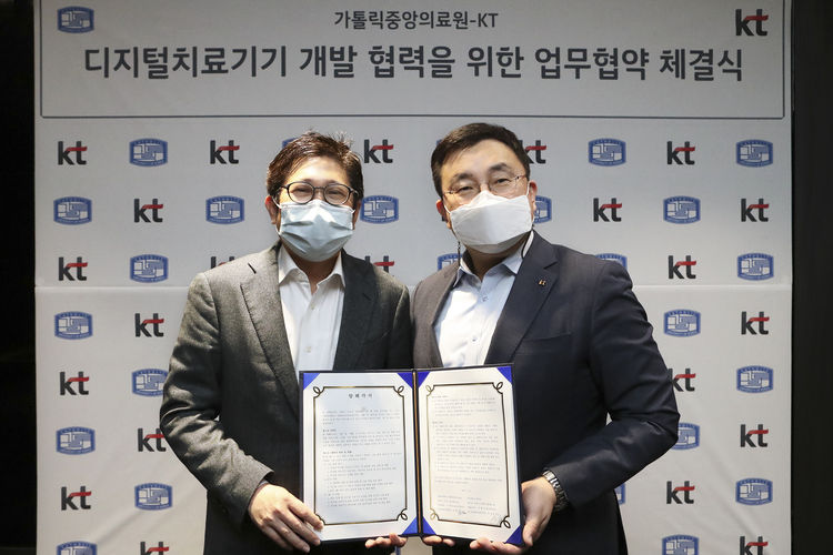 송재호 KT AI/DX융합사업부문장(부사장)은 "가톨릭중앙의료원과의 협력으로 중독개선, 재활 및 만성질환 관리 등 디지털 치료기기 분야에서 다양한 레퍼런스를 만들어 낼 것"이라며 "향후 플랫폼 기반 서비스를 통해 개인의 맞춤형 치료가 가능할 것으로 기대한다"고 말했다.
