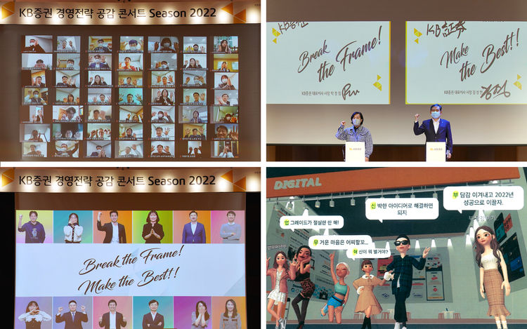 마지막으로 3부(Make the prime)는 새로운 도약을 위해 2022년 경영전략 방향인 “투자솔루션 역량 중심 Biz별 사업모델 고도화 및 Digital 플랫폼 Biz의 전략적 확장”을 중심으로 각 부문별 전략 방향과 중점 추진 사항에 대한 공감대를 강화하고, 임직원들이 메타버스를 이용하여 만든 재치 있는 부·점별 각오를 함께 공유하면서 한 해를 힘차게 출발했다.