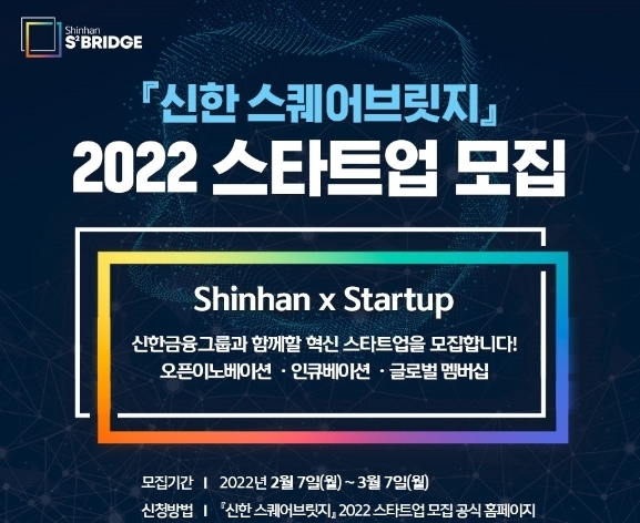 【 청년일보 】 신한금융그룹은 7일부터 한 달간 그룹의 스타트업 육성 플랫폼인 '신한 스퀘어브릿지'에서 함께 성장할 스타트업을 모집한다고 밝혔다.