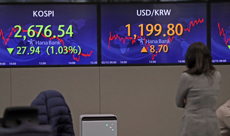 15일 한국거래소에 따르면 코스피는 전 거래일보다 27.94포인ㅌ(1.03%) 하락한 2,676.54에 거래를 마쳤다. 이는 종가 기준 지난달 28일(2,663.34)이후 9거래일 만에 2,600대를 기록했다.