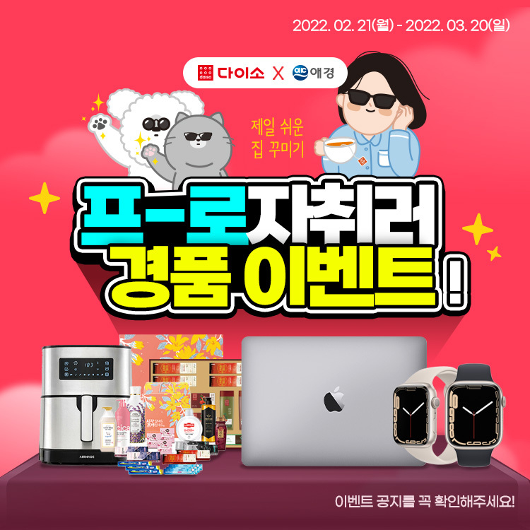 이벤트 기간 내 '프로자취러 애경 상품' 최대 금액 구매자에게는 맥북 에어(512G), 최다 수량 구매자에게는 애플 워치 7을 증정한다. 또, 추첨을 통해 에어 프라이어 등 다양한 경품을 제공한다. 자세한 사항은 샵(#)다이소 앱에서 확인할 수 있다. 단, 5만 원 초과 경품에 대한 제세공과금(22%)는 본인 부담이다.