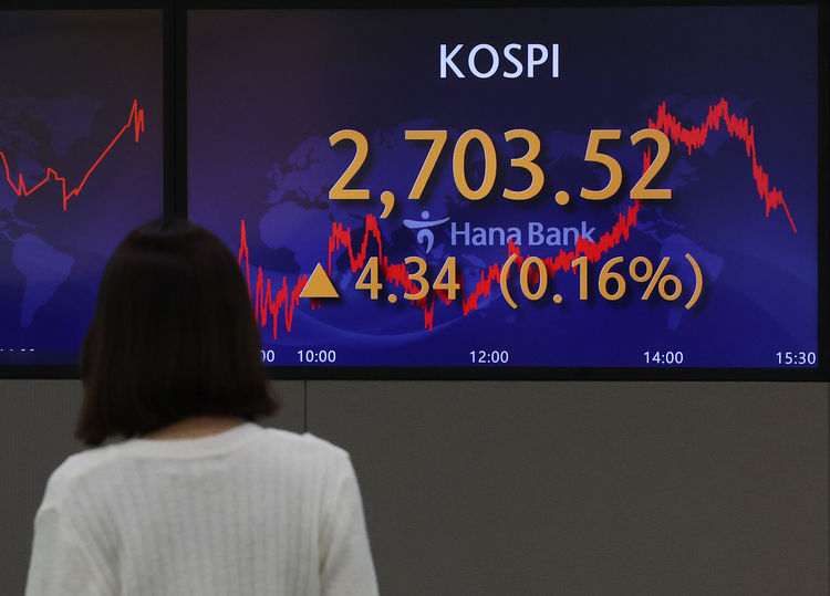 2일 한국거래소에 따르면 코스피는 전 거래일보다 4.34포인트(0.16%) 오른 2,703.52에 거래를 마쳤다. 지수는 0.87포인트(0.03%) 내린 2,698.31에 출발한 뒤 뚜렷한 방향 없이 혼조세를 보였다. 이후 정오께 상승 전환해 오후 들어 상승 폭을 키우다 장 마감 즈음 상승 폭을 일부 반납했다.