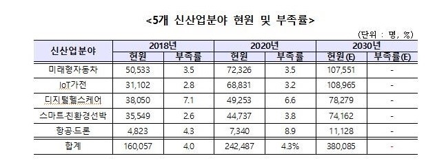 2020년 말 기준으로 5개 유망 신산업의 산업기술인력은 24만2천487명으로, 2018년 조사 때(16만57명)보다 1.5배 증가했지만, 여전히 1만892명의 인력이 부족해 부족률이 4.2%로 집계됐다.