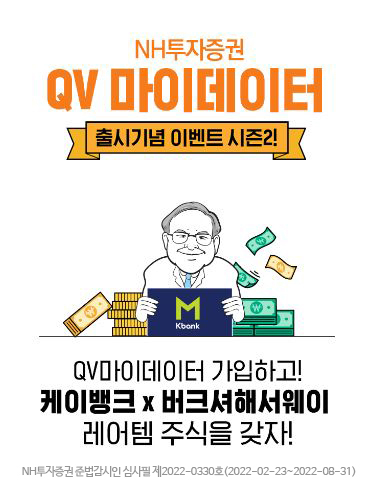 두 번째, QV 마이데이터 가입 고객(기존, 신규 포함) 중 최초로 해외주식 1백만원(원화기준) 이상 거래 시 버크셔헤서웨이 A주(BRK.A) 0.005%(최대 3만원 상당, 소수점 지급)를 선착순 2만명에게 지급한다. 버크셔헤서웨이 A주는 워렌버핏이 운영하는 세계에서 가장 비싼 주식이며, 업계에서 유일하게 NH투자증권에서만 소수점 거래가 가능한 종목이다.
