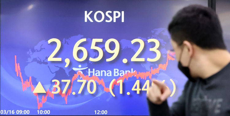16일 한국거래소에 따르면 코스피는 전 거래일보다 37.70포인트(1.44%) 오른 2,659.23에 마감했다. 종가 기준으로 하락한 지 사흘만에 반등했다. 지수는 전장보다 28.32포인트(1.08%) 상승한 2,649.85에 시작해 강세 흐름을 이어갔다.