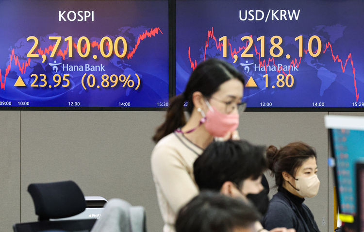 22일 한국거래소에 따르면 코스피는 전날보다 23.95포인트(0.89%) 오른 2,710.00에 장을 마쳤다. 지수는 전장보다 0.63포인트(0.02%) 상승한 2,686.68에 출발해 우상향 곡선을 그렷다.