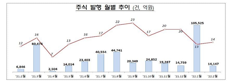 LG에너지솔루션 등 대형 기업공개(IPO)가 진행된 1월(10조3천907억원)과 비교하면 발행액이 97.8% 줄었다.
