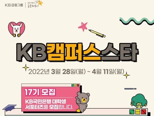 【 청년일보 】 KB국민은행은 오는 4월 11일까지 대학생 서포터즈 'KB캠퍼스스타' 17기를 모집한다고 29일 밝혔다.