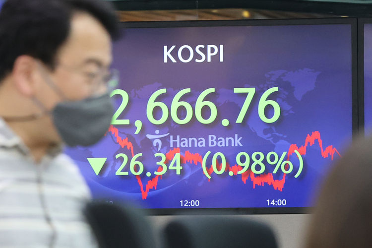 12일 한국거래소에 따르면 코스피는 전 거래일보다 26.34포인트(0.98%) 내린 2,666.76에 장을 마쳤다. 지수는 종가 기준으로 지난달 16일(2,659.23) 이후 가장 낮은 수준까지 하락했다.