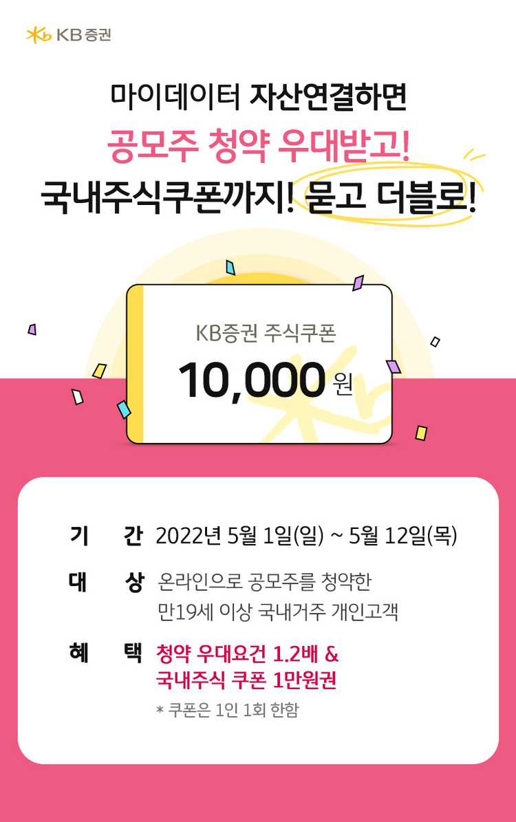 이번 이벤트는 온라인으로 공모주를 청약하는 고객 대상으로 12일까지 마이데이터 자산을 연결(KB증권 외 은행·카드·증권 타금융기관)하면 청약 우대요건 1.2배를 적용한다.