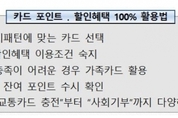 <금융감독원>카드를쓰는만큼포인트가쌓이지만제대로사용하지못해매년버리는돈이되기십상이다. 카드사에서제공하는포인트나할인혜택을최대한활용하기위해서는우선자신의소비패턴에맞는카드를자신의주이용카드로선택하는것이중요하다. 소비패턴에맞는카드를선택해야포인트적립률을높일수있고,나아가적립된포인트의활용도나할인혜택을높일수있기때문이다. 자신의소비패턴을분석하는가장쉬운방법은카드대금명세서를확인해보면된다. 평소본인이카드포인트이용에관심이적은편이라면되도록연회비가저렴한카드를발급받거나포인트적립등부가서비스가1~2가지에집중된카드를이용하는것이유리할수있다. 카드포인트나할인혜택을제대로활용하기위해서는상품안내장이나카드사홈페이지를통해포인트이용조건을알아둬야한다. 특히'전월실적산정시제외대상'또는'포인트적립제외대상'등을꼼꼼히확인해야한다.(청구)할인받은해당매출건전체에대해전월실적에서제외하는경우할인혜택조건을충족하지못할수있다.또대학등록금,무이자할부,선불카드충전금액등은포인트적립대상에서제외하는경우도많다. 배우자,부모,자녀등이각각다른카드를이용할경우전월실적등이용조건을충족하기어려운경우가종종있다.이럴경우가족카드로묶어서카드를이용하게되면이용조건충족이용이해져보다높은등급(수준)의할인혜택등을받을수있다. 다만가족간카드