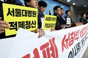 30일서울여의도국회정론관에서열린'서창석서울대병원장해임건의이사회개최촉구'기자회견에서참석자들이서창석서울대병원장의해임을위한이사회개최와즉각파면을촉구하고있다.<뉴스1>서울대병원이올해비정규직1600명을정규직으로전환한다.서울대병원노동조합이무기한파업에돌입한지이틀만이다. 서울대병원과노조는지난13일오후8시30분이같은내용과함께노사임금및단체협약을타결했다고14일밝혔다. 이번협상으로우선서울대병원노사는무기계약직을연내정규직으로전환한다. 기간제직종의경우6개월이상근무자는연내무기계약직으로전황하고,6개월미만근무자는내년1분기중으로소정의절차를거쳐무기계약직전환하기로했다. 다만간접고용직종에대해서는내년1분기내에노사가같은인원으로참여하는협의기구를구성해논의한다. 또서울대병원노사는내년임금인상폭을총액대비3.5%로인상하기로했다. 앞서서울대병원노조는지난12일정부가'공공기관비정규직제로'를선포했지만서창석서울대병원장은비정규직160여명에대한전환정책을내놓지않고있다며총파업에돌입했다. 노조는△서창석원장퇴진등부정부패및인적적폐청산△비정규직1600명의정규직전환△의사성과급제폐지△신입직원임금삭감및강제복지삭감복원△외상센터및화상센터운영등을주장해왔다. 당초양측의입장이팽팽해총파업이장기화할우려가제기됐지만총