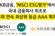 【 청년일보 】 KB금융그룹(회장 양종희, 이하 KB금융)은 18일 모건스탠리캐피털인터내셔널(MSCI, Morgan Stanley Capital International, 이하 MSCI)의 '2025년 MSCI ESG평가'에서 국내 금융회사 최초로 4회 연속 최상위 등급인 'AAA' 등급을 획득했다고 18일 밝혔다. 'MSCI ESG평가'는 세계적인 투자 연구 기관인 MSCI에서 매년 전 세계 약 8,500개 상장기업을 대상으로 ESG 경영성과를 종합적으로 평가하는 대표적인 글로벌 ESG 평가지표 중 하나로, MSCI는 AAA(최고)부터 CCC(최저)까지 총 7 단계로 결과를 발표하고 있다. KB금융은 이번 평가에서 ‘기업 지배구조’, ‘친환경 금융’, ‘인적자본’, ‘정보보호 및 데이터 보안’ 등 주요 항목에서 우수한 평가를 받았다. 국내 금융사 중 유일하게 ‘AAA’ 등급을 4회 연속 획득함으로써 국내외 최고 수준의 ESG 경영 역량을 다시 한번 입증했다. KB금융은 ‘MSCI ESG평가’뿐 아니라 ‘서스테이널리틱스(Sustainalytics) ESG리스크 평가’에서 국내 금융회사 중 최고 등급인 ‘Low Risk 등급’으로 평가받았고, ‘다우존스 지속가