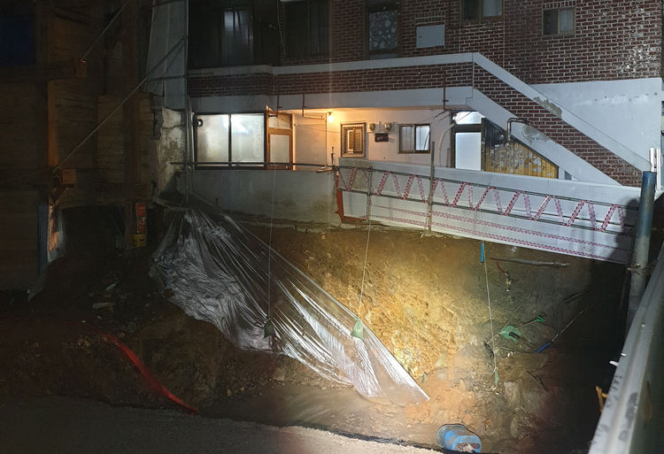 17일 부천시와 부천소방서에 따르면 이날 오전 3시 32분께 부천시 소사본동의 신축 아파트 공사장 인근 다세대주택에서 담장과 외부 통로 바닥이 무너져 주택 입주민 10여명이 대피하는 소동이 발생했다.