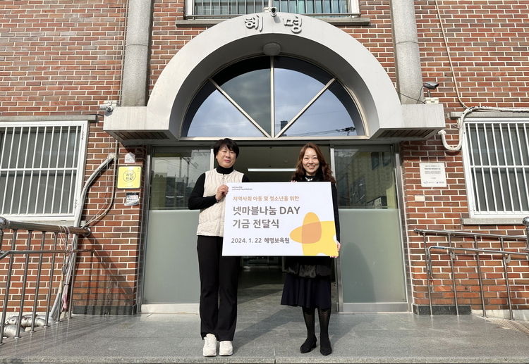 【 청년일보 】 넷마블문화재단은 지난해 12월 진행된 '2023 넷마블나눔 DAY' 수익금과 재단이 동일 금액을 매칭한 약 1천100만원의 기금을 사옥 인근 지역의 보육시설 2개소에 전달했다고 23일 밝혔다.