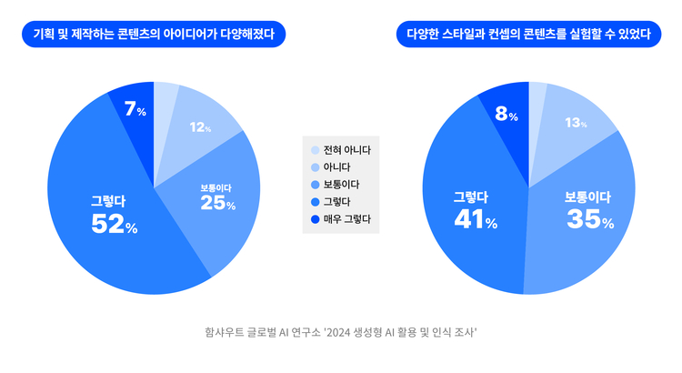 광고와 디지털 콘텐츠를 제작하는 업무에도 생성형 AI가 큰 영향을 미친 것으로 나타났다. 전체 응답자의 59%는 생성형 AI를 활용하면서 '기획 및 제작하는 콘텐츠의 아이디어가 다양해졌다'고 답했다.