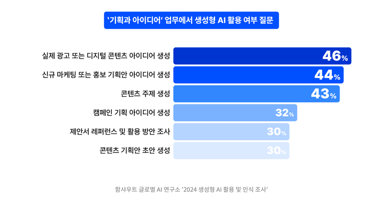 뿐만 아니라, '실제 광고 또는 디지털 콘텐츠 아이디어 생성을 위해 AI를 활용한다'는 응답이 전체 46%, '신규 마케팅 또는 홍보 기획안 아이디어 생성을 위해 AI를 활용한다'는 응답은 44%를 차지했다.