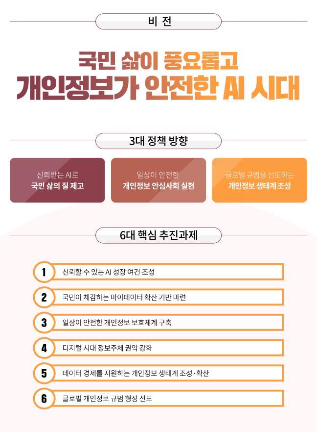 6대 핵심 추진과제는 ▲신뢰할 수 있는 AI 성장 여건 조성 ▲디지털 시대 정보주체 권익 강화 ▲국민이 체감하는 마이데이터 확산 기반 마련 ▲데이터 경제를 지원하는 개인정보 생태계 조성·확산 ▲일상이 안전한 개인정보 보호체계 구축 ▲글로벌 개인정보 규범 형성 선도 등이다.