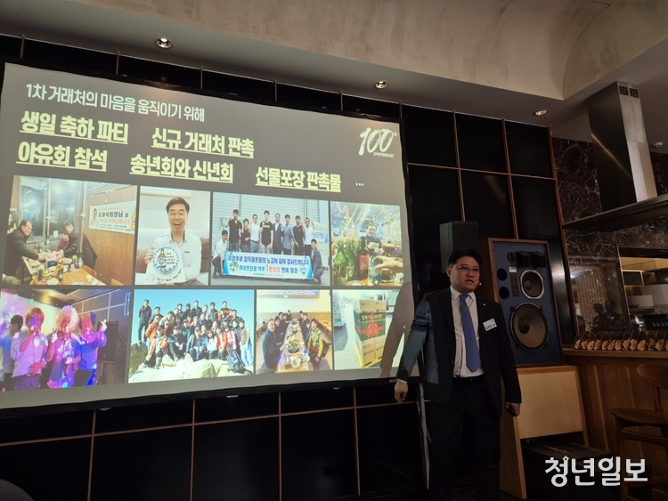 김현진 하이트진로 영업부문 상무가 자신감 넘치는 목소리로 회사의 100년간 영업에 대해 설명하자 장내는 일순간 조용해졌다.