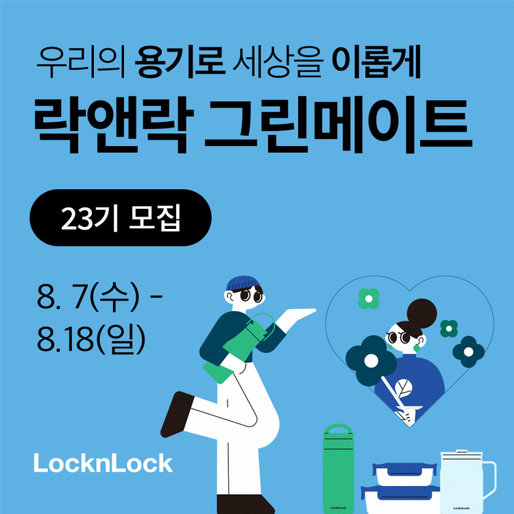 【 청년일보 】 락앤락은 친환경 대학생 서포터즈 ‘그린메이트 23기’를 모집한다고 7일 밝혔다.