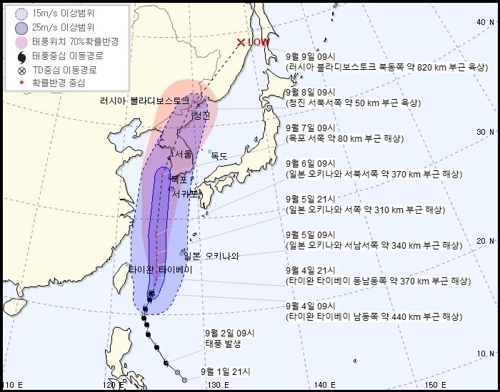앞으로 이동 속도가 빨라지면서 금요일인 6일 오전 9시께 일본 오키나와 서북서쪽 약 370㎞ 해상을 지나 토요일인 7일 오전 9시께 전남 목포 서쪽 약 80㎞ 해상에 도달할 것으로 기상청은 내다봤다.