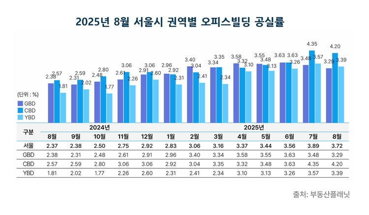8월 서울시 오피스빌딩 공실률은 3.72%로 전월(3.89%) 대비 0.17%p 하락했다. 3대 주요 권역 모두 공실률이 낮아졌다. CBD는 4.20%, YBD는 3.39%, GBD는 3.29%로 집계됐다.