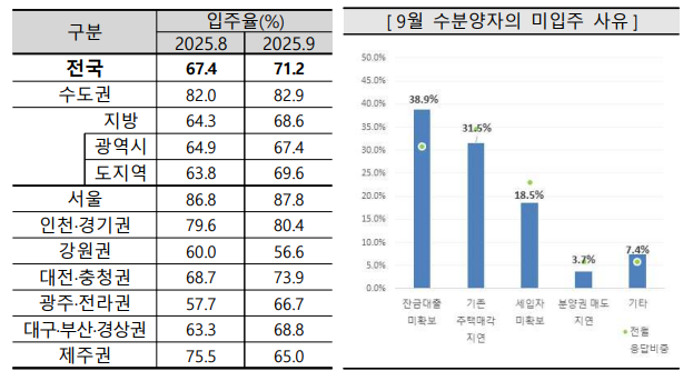 미입주 사유는 잔금대출 미확보(38.9%), 기존주택 매각지연(31.5%), 세입자 미확보(18.5%), 분양권 매도지연(3.7%) 순으로 나타났다.