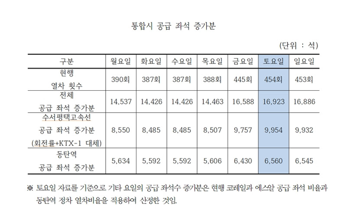 21일 국회 국토교통위원회 소속 더불어민주당 전용기 의원실이 발간한 정책자료집에 따르면, 코레일과 SR을 통합할 경우 수서고속선에서 9천954석, 동탄역에서 6천560석 등 하루 최대 1만6천923석의 좌석을 추가 확보할 수 있는 것으로 나타났다.