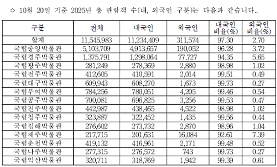 하지만 정 의원은 외국인 비율에 주목했다. 그는 "성과 자체는 의미 있으나 관람객의 96%가 내국인이라는 점은 국제 경쟁력 측면에서 아쉽다"며 "정부가 K-관광 3천만명을 추진한다면, 국가 대표 박물관의 외국인 접근 환경부터 점검해야 한다"고 지적했다.