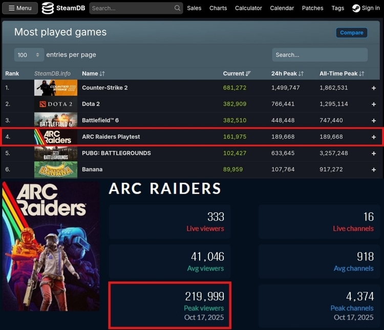 엠바크 스튜디오는 테스트 종료 직후 핵심 지표를 인포그래픽 형태로 공개했다. 3일간 진행된 '서버 슬램'에서 총 3천만회 이상의 라운드가 플레이됐으며, 이용자들은 5천800만기의 기계 생명체 '아크(ARC)'를 격파했다.