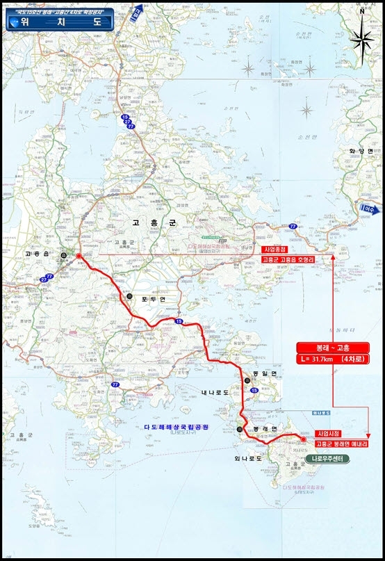 '국도 15호선 고흥~봉래 확장사업'은 전남 고흥군 고흥읍 호형리부터 봉래면 예내리(나로우주센터)까지의 31.7km 구간을 기존 2차로에서 4차로로 확장하는 사업으로 총 사업비는 6천521억원(예비타당성조사 기준) 규모다.