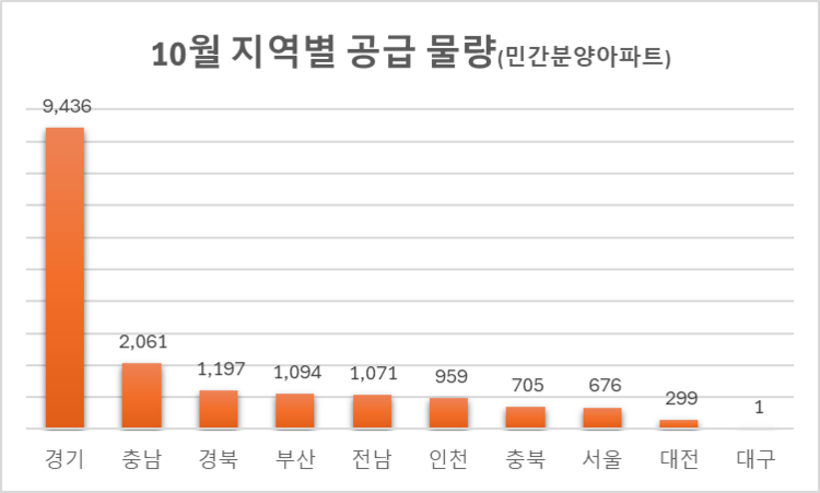 파주 '운정 아이파크 시티'(3천250가구), 김포 '풍무역 푸르지오 더 마크'(1천524가구) 등 서북권 신도시와 평택 '브레인시티 비스타동원'(1천600가구) 등이 공급을 이끌었다.