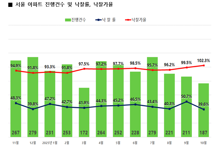 경·공매 데이터 전문기업 지지옥션이 전날 발표한 ‘2025년 10월 경매동향보고서’에 따르면, 지난달 서울 아파트 낙찰가율은 102.3%로 전달(99.5%) 대비 2.8%p 상승했다.